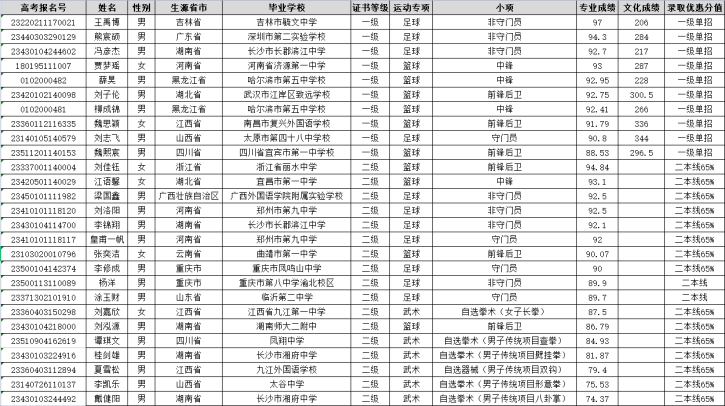 根据教育部关于部分特殊类型招生有关规定和《三峡大学2023年高水平运动队招生简章》相关办法,按照招生办法、考生测试成绩及我校高水平运动队的建队需要,择优确定高水平运动队招生入围资格,经学校招生工作领导小组研究,现将名单予以公示。